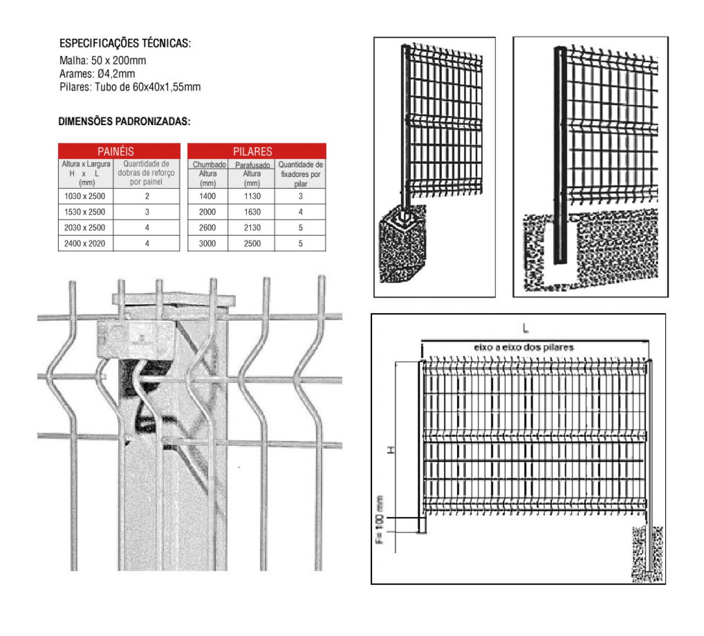 Composta por arames verticais e horizontais, a estrutura do gradil eletrofundido 3D formam malhas retangulares e, por meio de dobras de reforço, enrijecem os painéis garantindo estabilidade com design diferenciado. O gradil é fixado nas colunas tubulares através de presilhas de poliamida e parafusos autobrocantes. A instalação poderá ser feita chumbado ou parafusado.