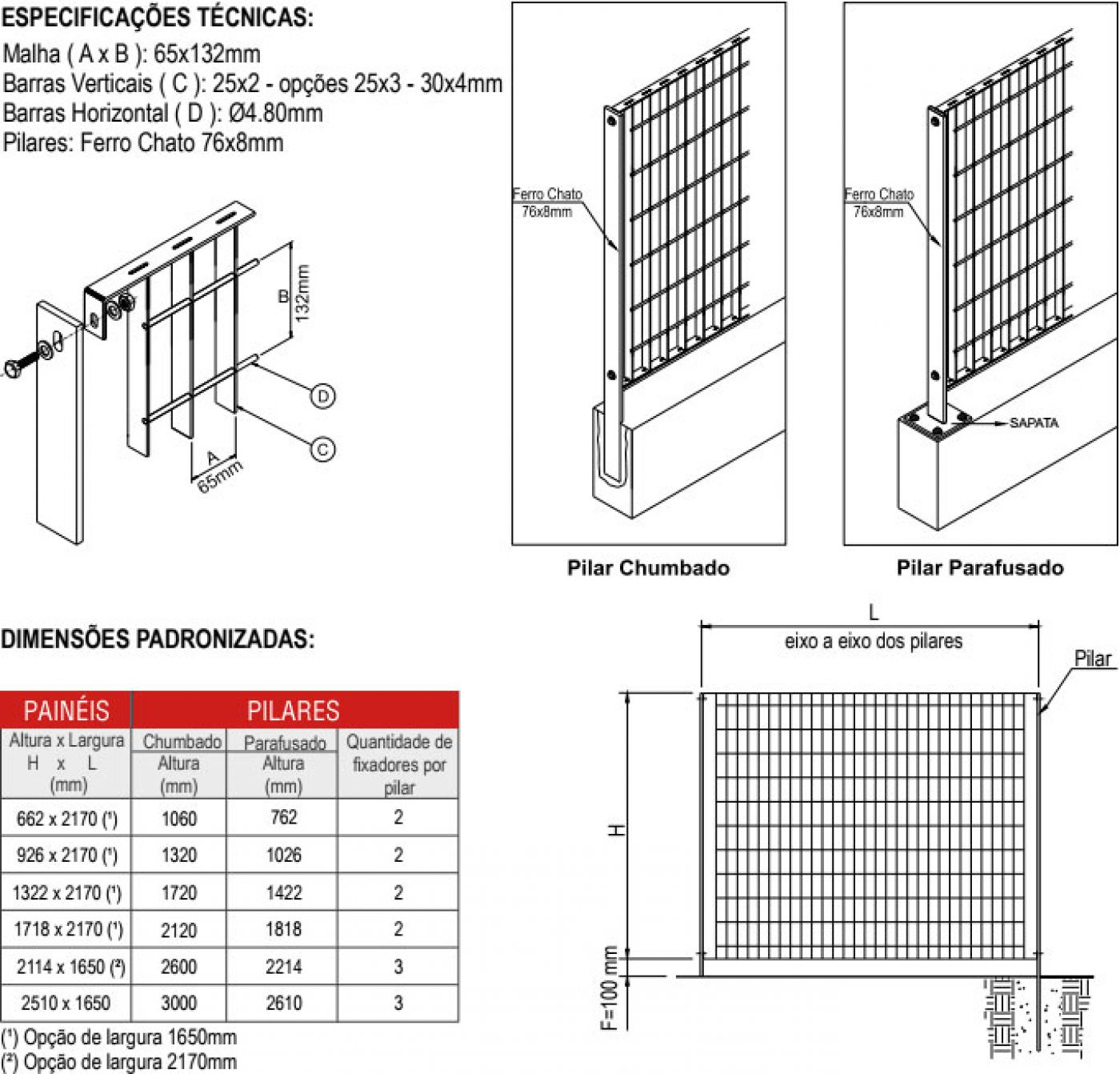 Configurado por malhas retangulares, o gradil eletrofundido Artis, é composto estruturalmente por barras chatas verticais em três bitolas opcionais, arames redondos horizontais, moldura eletrofundida reforçada, pilares de fixação em ferro chato laminado para chumbar ou parafusar (com sapata), parafusos sextavados ou anti-roubo em aço inoxidavel, chumbadores de expansão ou quimicos para fixação dos pilares parafusados (com sapata).