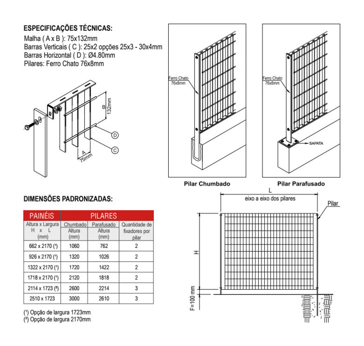 Configurado por malhas retangulares, o gradil eletrofundido Sigma é composto estruturalmente por barras chatas verticais em três bitolas opcionais, arames redondos horizontais, moldura eletrofundida reforçada, pilares de fixação em ferro chato laminado para chumbar ou parafusar (com sapata), parafusos sextavados ou anti-roubo em aço inoxidável, chumbadores de expansão ou químicos para fixação dos pilares parafusados (com sapata)